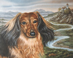 1996Portret van de langharige tekkel Oscar met bijbehorend Duits landschap.